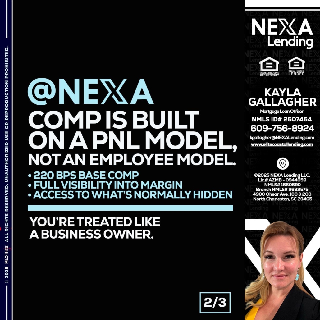 2 OF 3 - Kayla Gallagher -Mortgage Loan OfficerHi, my name is Kayla Gallagher. I’m a Loan Officer with NEXA Lending LLC., offering personalized mortgage solutions, fast customized quotes, great rates and service with integrity.